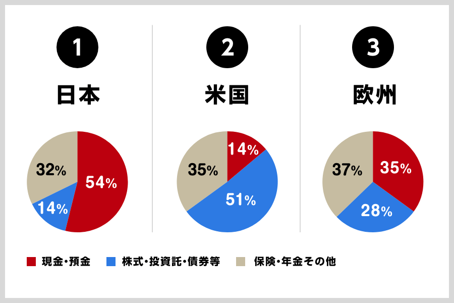 統計からみても日本人の資産は預貯金の割合が多いのがわかります。欧州では資産全体の中で現預金の占める割合が35%なのに対し、アメリカでは14%。それに比べると日本の54%は極端に高いとわかります。