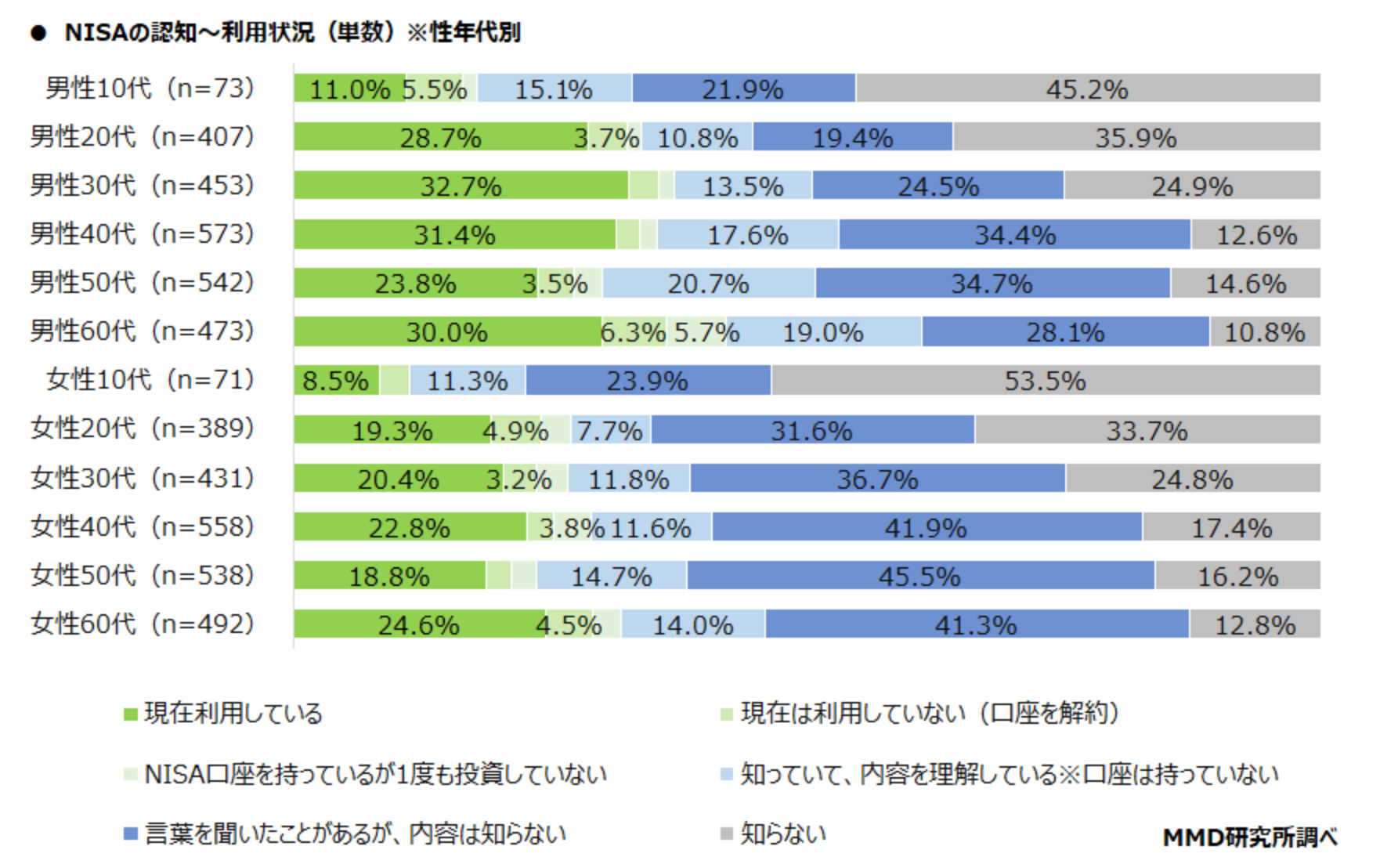 新NISAを含む金融商品に関する様々な調査がある中で私が氣になったのがNISAの認知~利用状況の年代別、性別ごとにまとめたデータでした。
